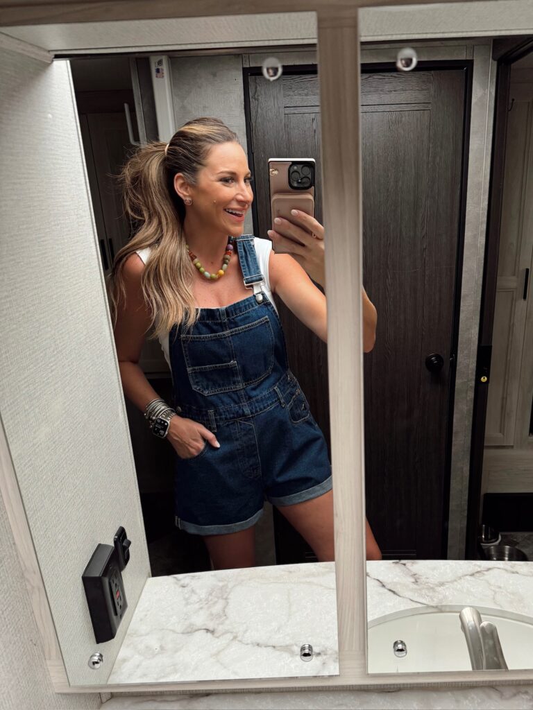 In a medium shorts overalls, small square neck tank (comes in a 2 pack), necklace and accessories – all fits TTS.
