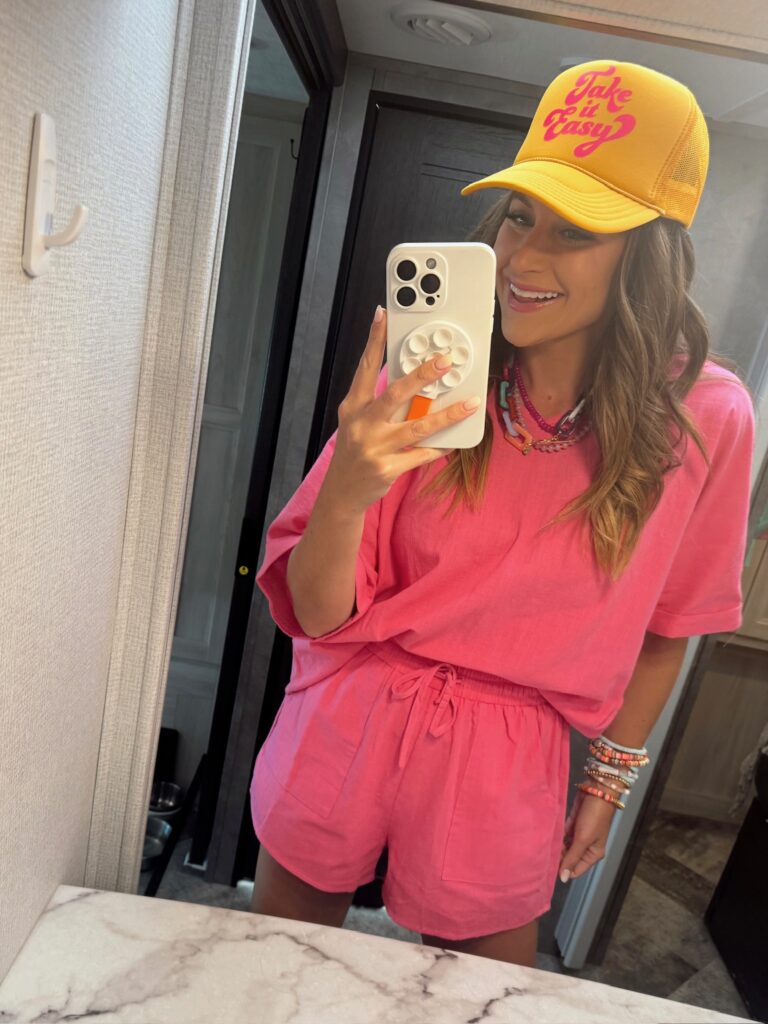 In a medium 2 piece set with oversized tee and shorts, hat, necklaces, bracelets and accessories for spring – all fits TTS.