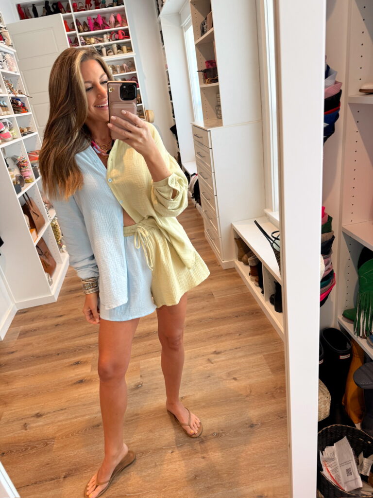 In a medium 2 piece colorblock set with button down top and shorts, sandals and accessories for spring – all fits TTS.