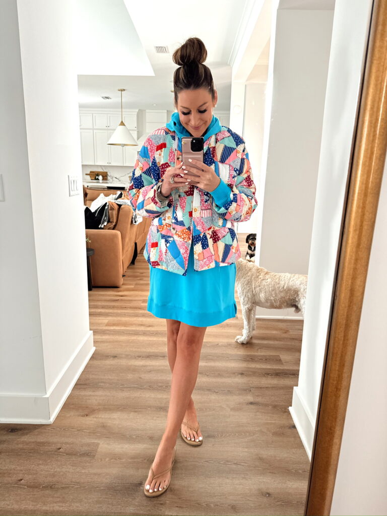 In a medium hooded sweatshirt dress, medium quilted jacket (my color way is sold out), sandals and accessories for spring outfit – all fits TTS.