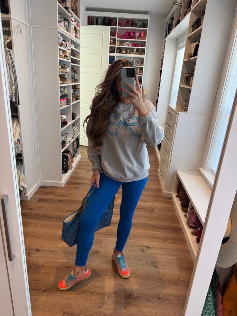 In a large bow sweatshirt, small leggings, sneakers and accessories – all fits tts. Shop the items here!