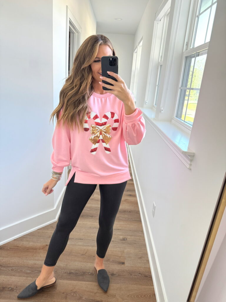 In a medium sequin candy cane sweatshirt, small leggings, mules and accessories for comfy winter look – all fits TTS.