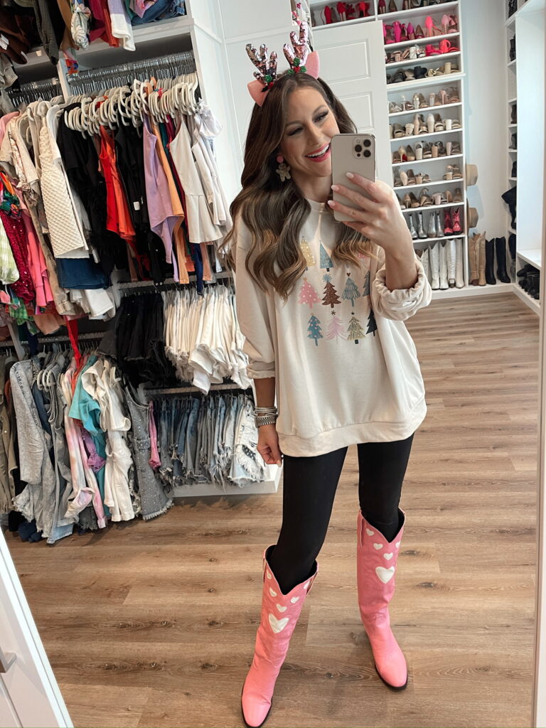 In an xl Christmas tree sweatshirt for oversized fit, small leggings, pink boots, sequin antler headband, acrylic gingerbread man earrings and accessories for Christmas – all fits TTS.