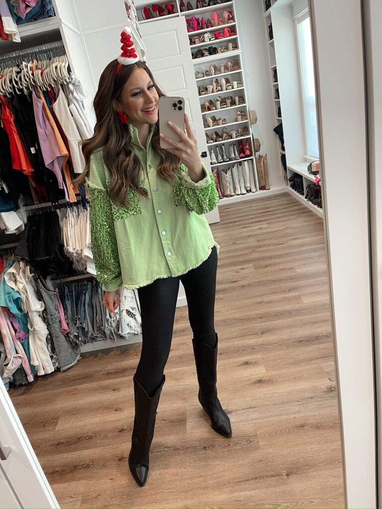 In a small sequin sleeve denim shacket, small leggings, boots, Christmas earrings and headband – all fits TTS.