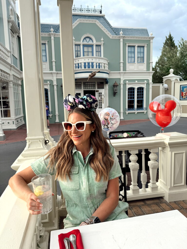 In a medium green denim romper, fanny pack, ears, sunglasses and accessories for spring Disney outfit – all fits TTS.