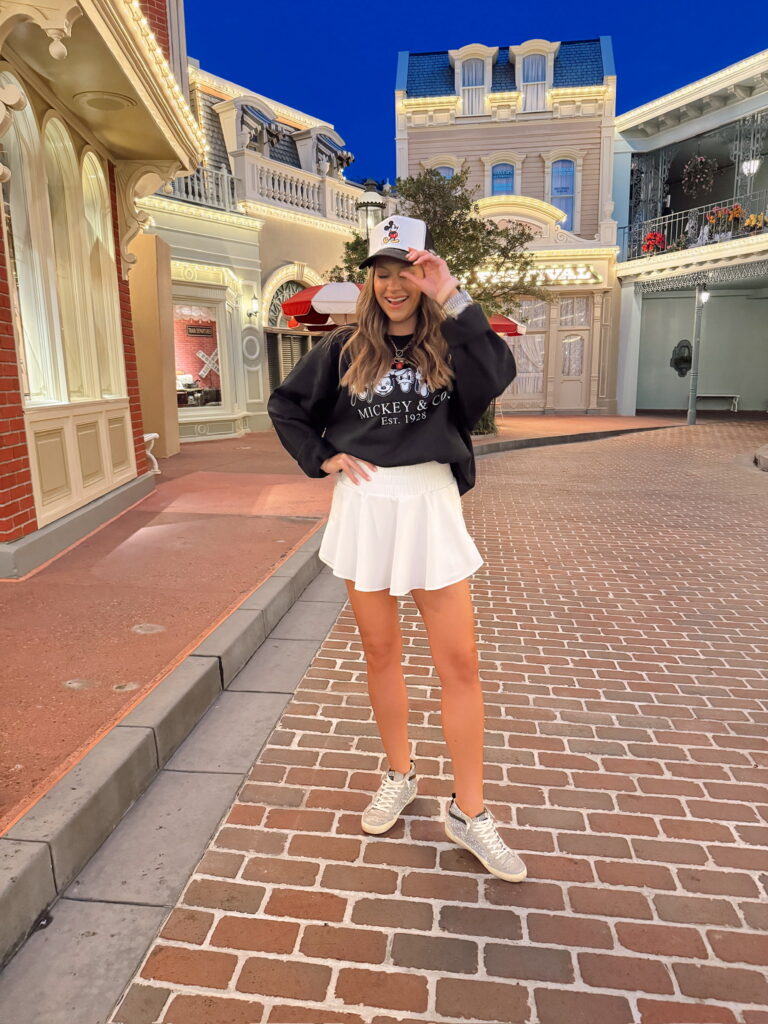 In a large Mickey & Co sweatshirt, medium athletic skort, diy hat and accessories for spring disney outfit – all fits TTS.