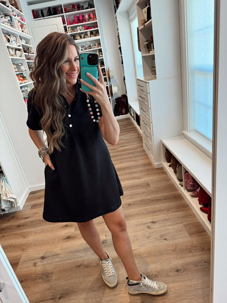 In a medium button collar dress, sneakers and accessories- fits tts. Shop the items here!