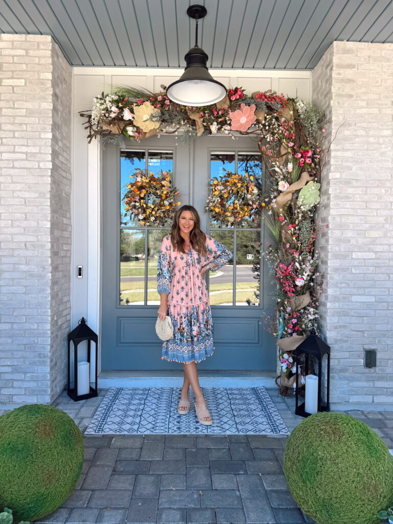 In a small boho midi dress, wedges, bag and accessories for spring – all fits TTS.