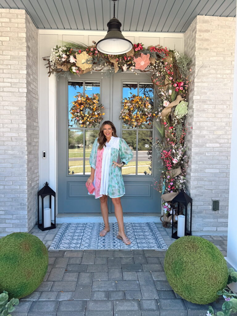 In a small long sleeve printed pattern dress, sandals, bag and accessories for spring – all fits TTS.