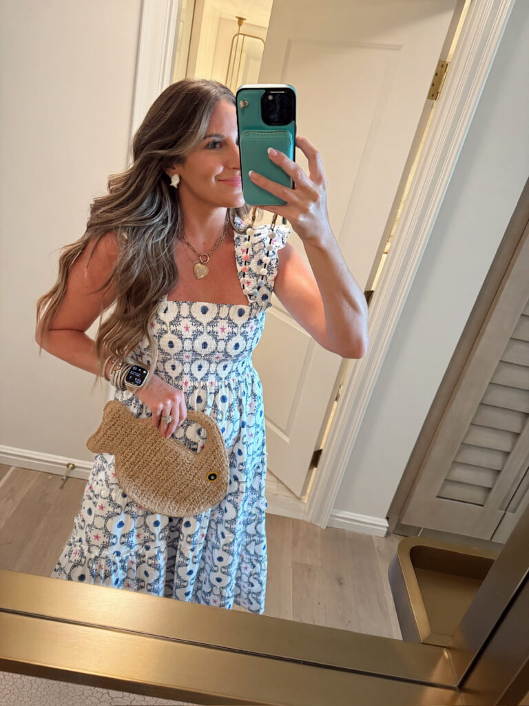 In a small Ellie nap dress, raffia fish bag, mother of pearl fish stud earrings and accessories – fits tts. Shop the items here!
