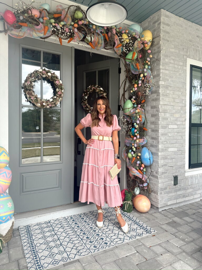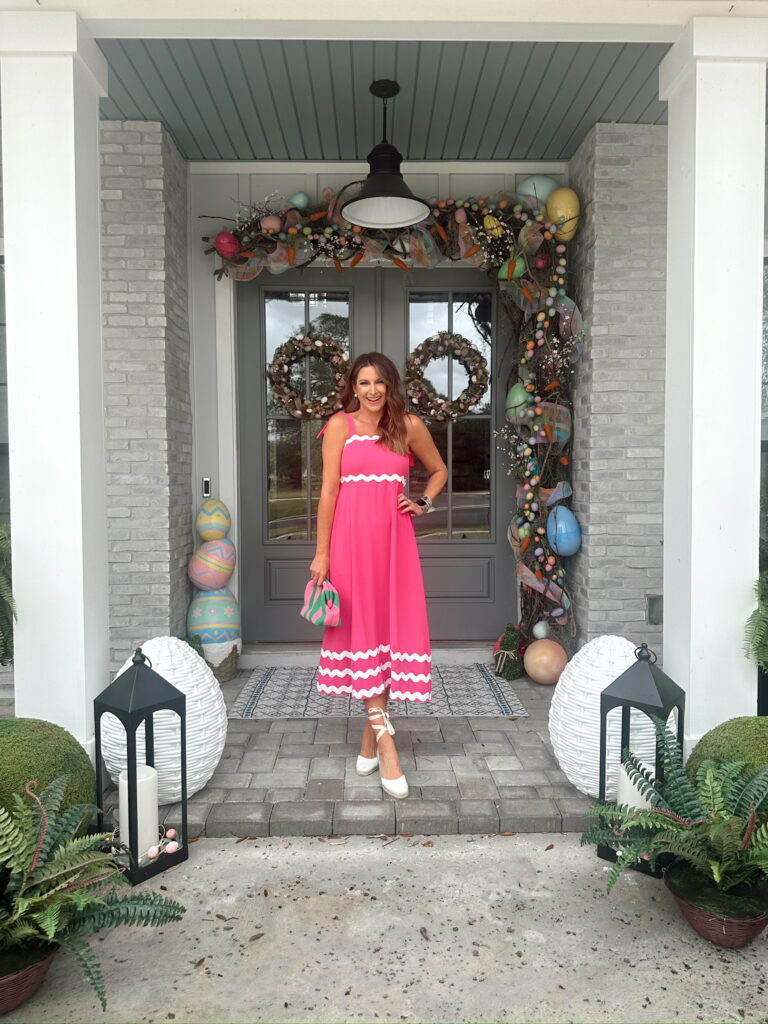 In a small tie shoulder maxi, tie espadrille wedges, clutch and accessories for spring/easter outfit – all fits TTS.