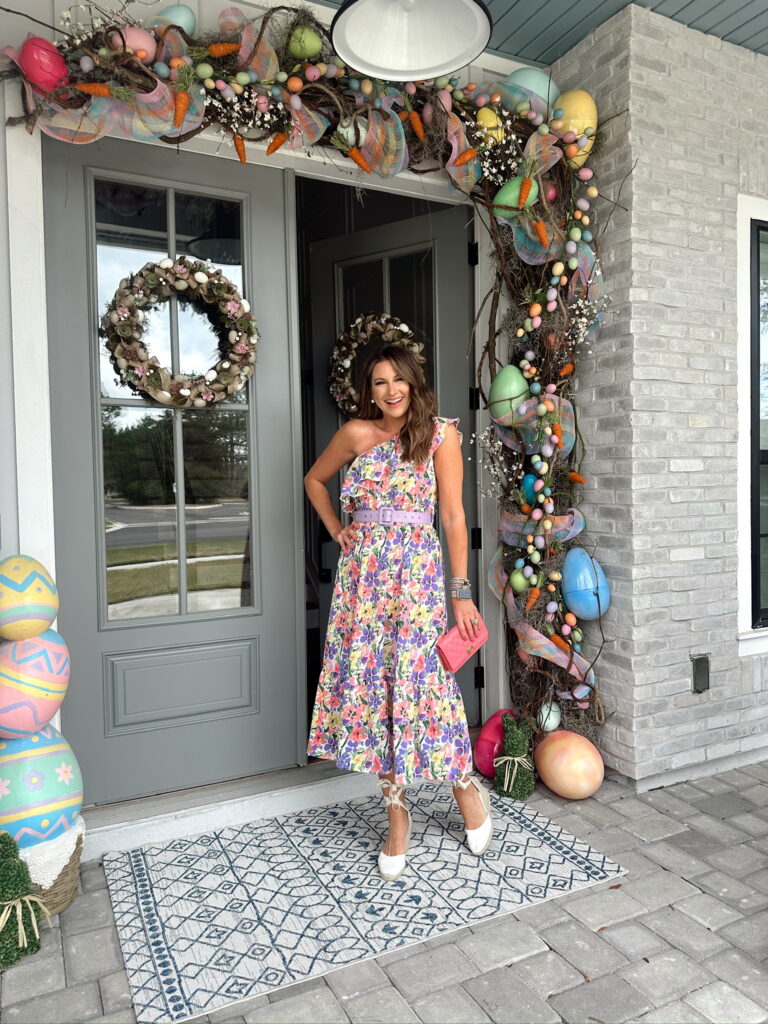 In a small one shoulder floral maxi, purple belt, tie up espadrille wedges and accessories for spring/Easter – all fits TTS.