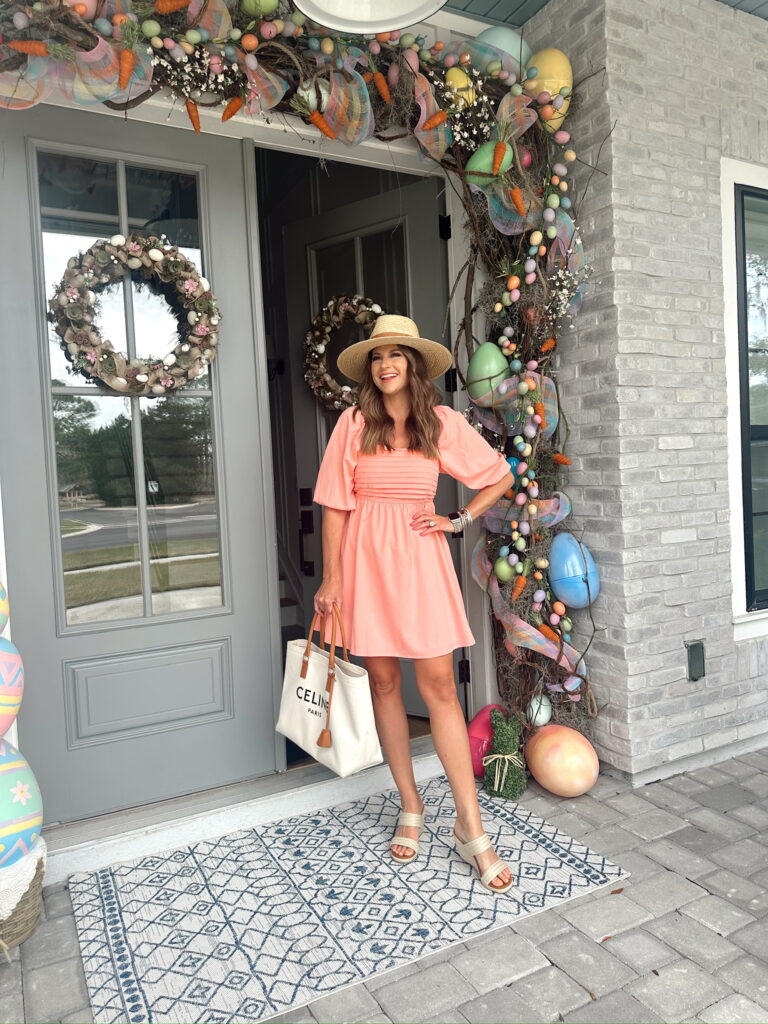 In a small square neck puff sleeve dress, hat, espdarille wedges and accessories for spring/Easter – all fits TTS.