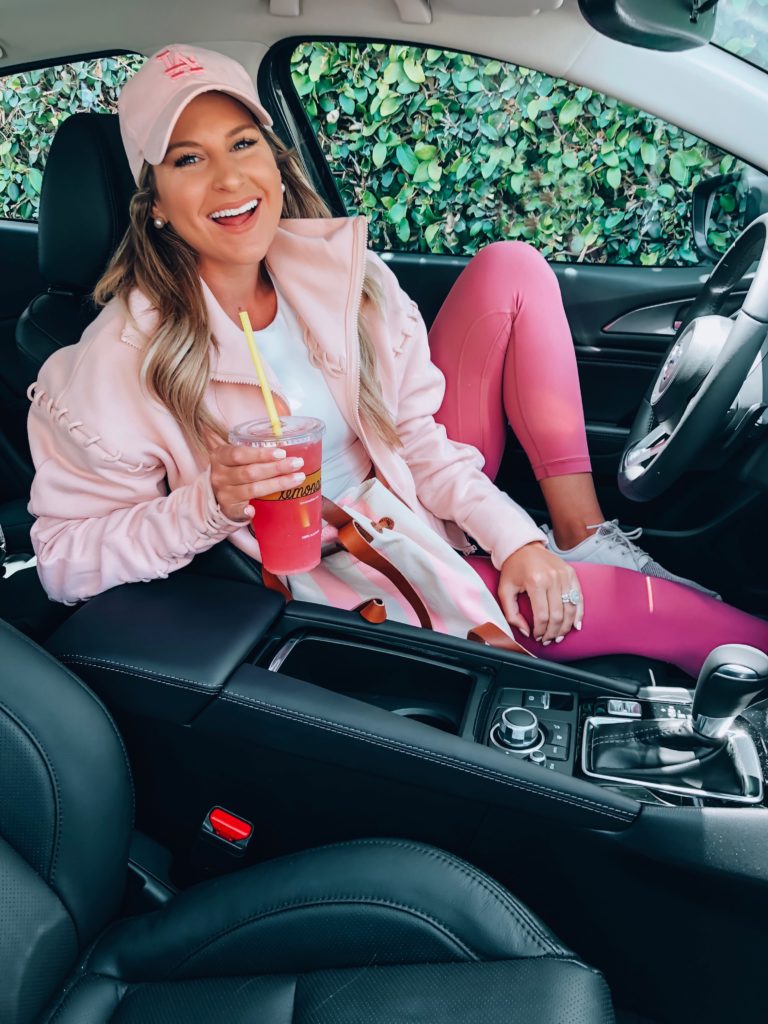 Outfit Details: LA Hat, Alo Jacket (wearing size small), Leggings, and Sport Bra Crop Top, with Nike Sneakers, my favorite self tanner, my everyday Pearl earrings.