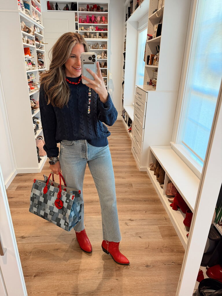 In a small red long sleeve top, size 4 rhinestone embellished wide leg jeans, ankle boots and accessories – fits tts. Shop the items here!