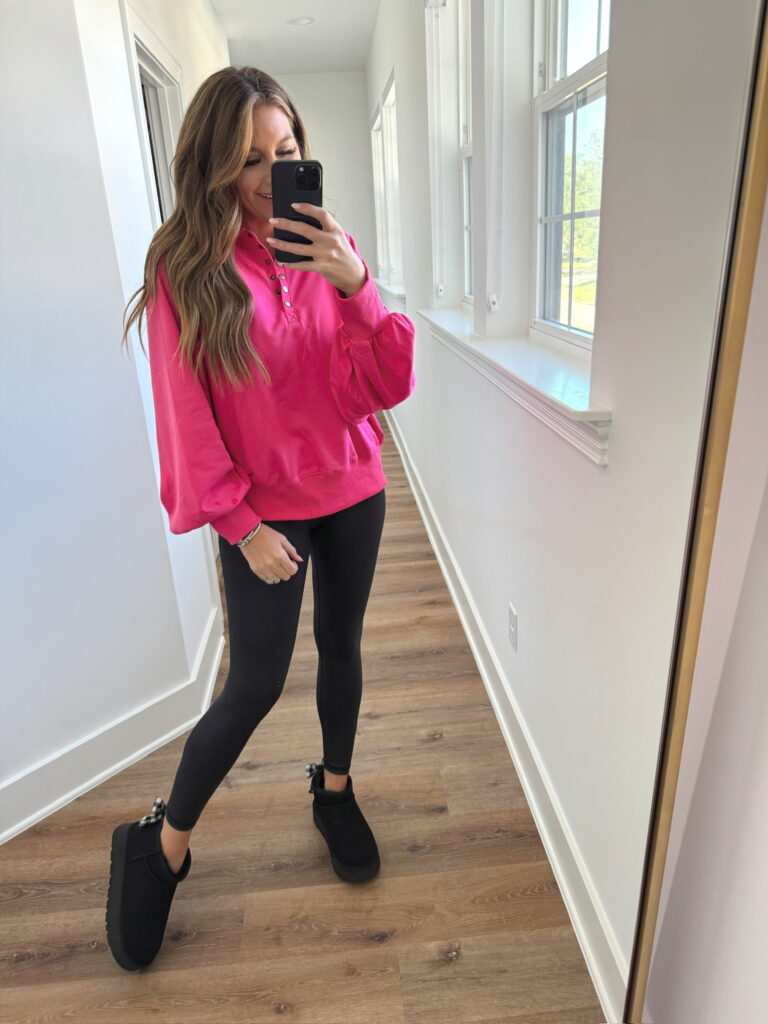 In a medium pink sweatshirt, small leggings, ankle boots and accessories for comfy winter look – all fits TTS.