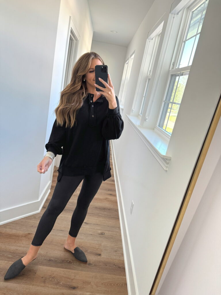 In a medium black sweatshirt, small leggings, mules and accessories for comfy winter look – all fits TTS.