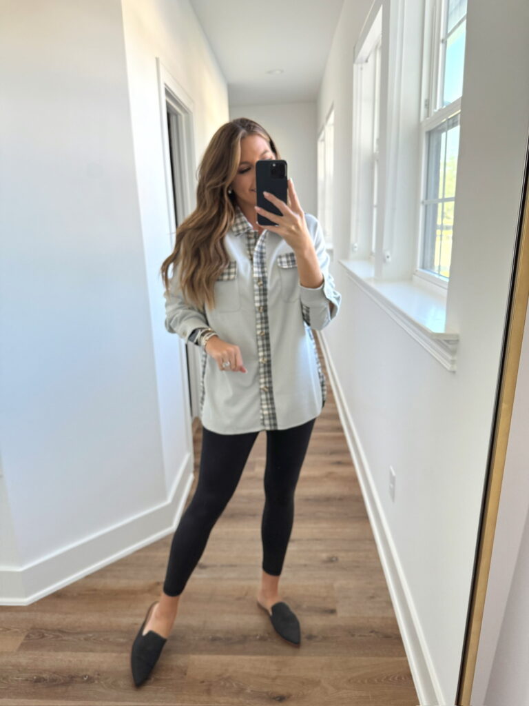 In a medium waffle plaid shacket, small leggings, mules and accessories for comfy winter look – all fits TTS.