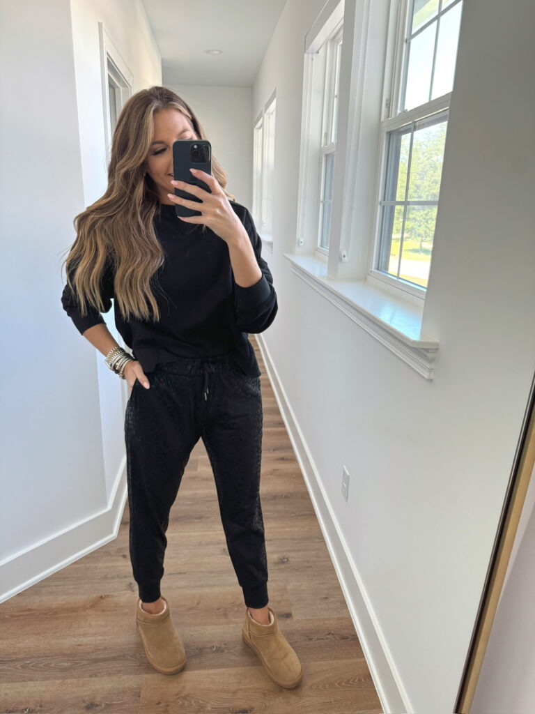 In a small black sweatshirt, medium leopard print joggers, ankle boots and accessories for comfy winter look – all fits TTS.