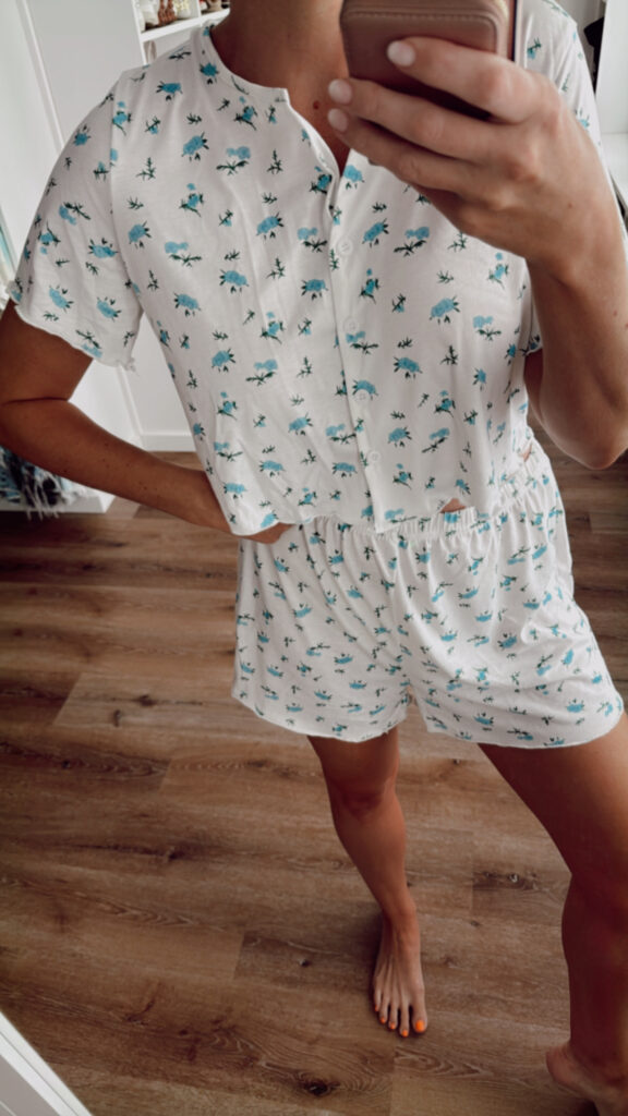 In a large two piece pajama set with shorts and button down top – fits TTS.