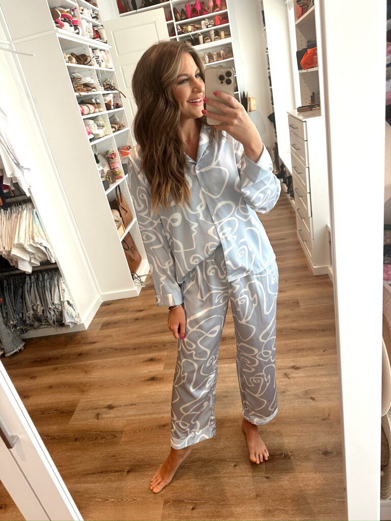 In a medium satin pajama set for spring – fits TTS.