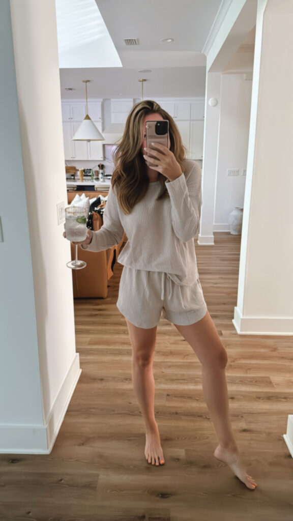 In a large two piece lounge set with long sleeve top and shorts – fits TTS.