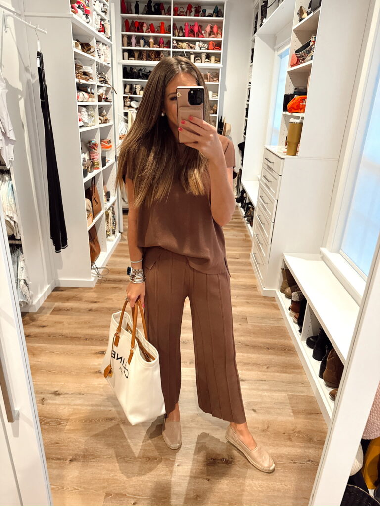 In a medium 2 piece set with knit top and wide leg pants, espadrilles and accessories for spring outfit – all fits TTS.