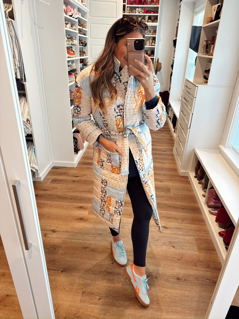 Quilted jacket in a size medium, maternity leggings in a size small and sneakers – all fits tts. Shop the items here!
