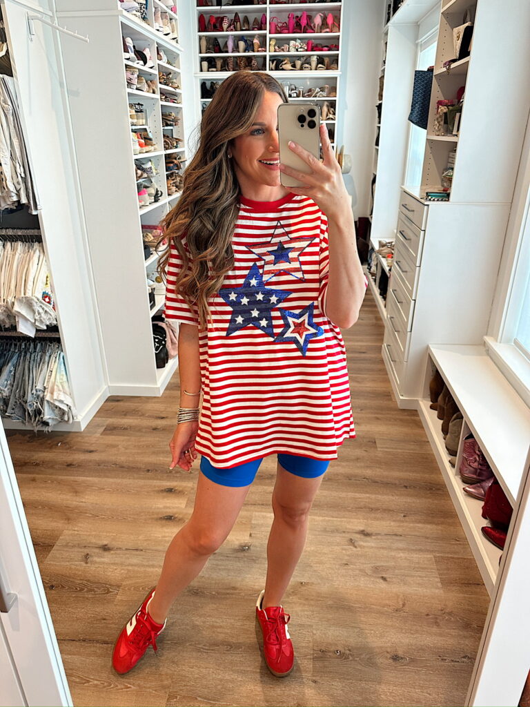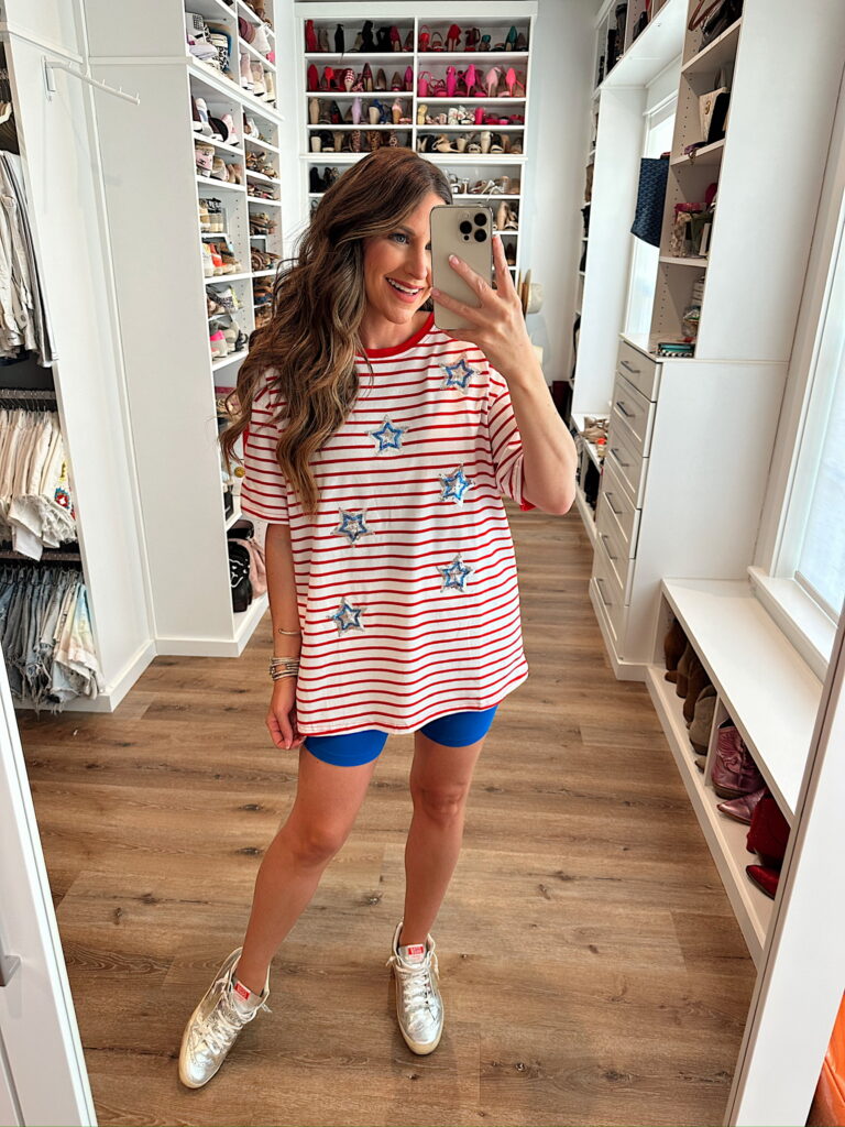 In a large sequin star stripe tee, small biker shorts, sneakers and accessories for patriotic look- fits tts. Shop the items here!