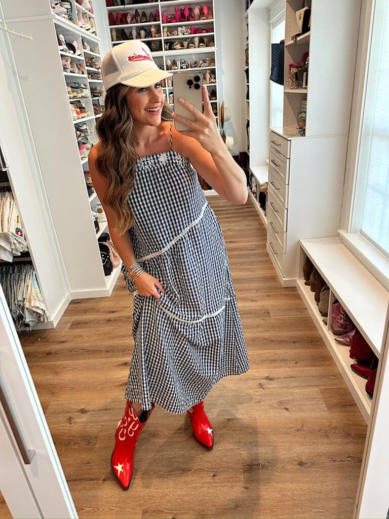 In a medium asymmetric boho maxi, America hat, red cowboy boots and accessories for patriotic look- fits tts. Shop the items here!