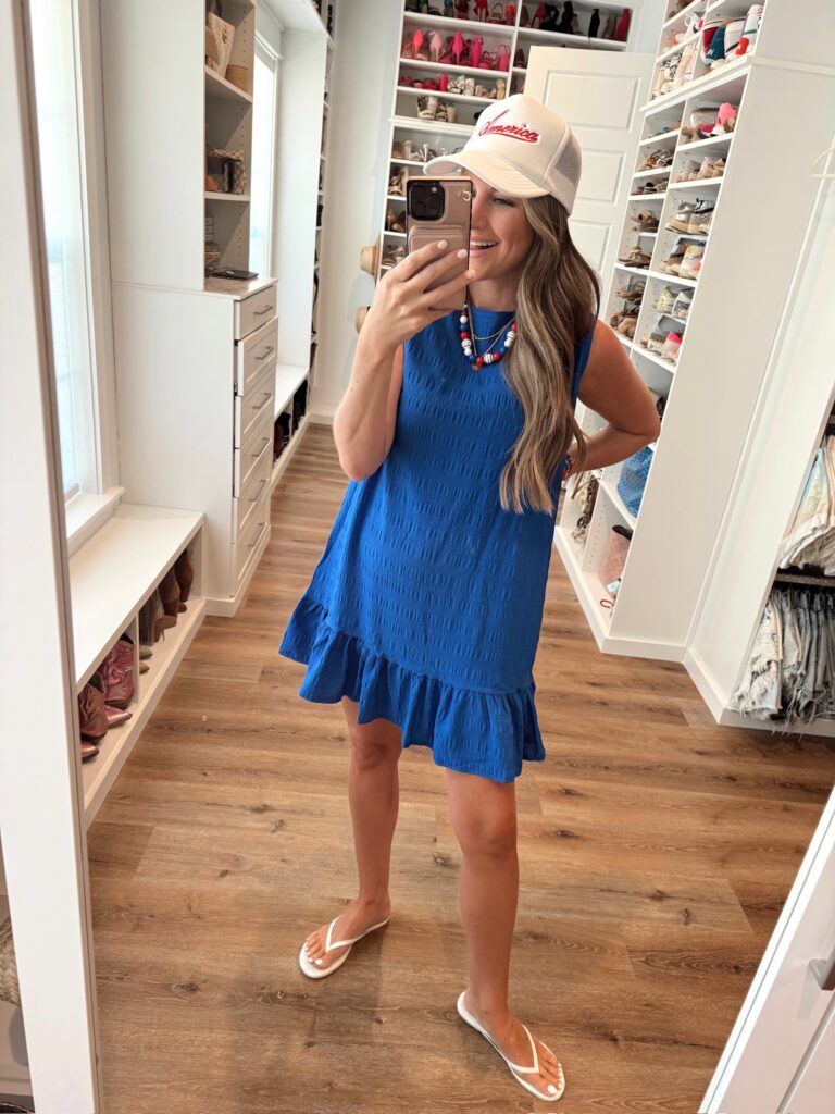 In a medium ruffle hem tank dress, sandals, hat, necklaces and accessories for patriotic outfit – all fits TTS.