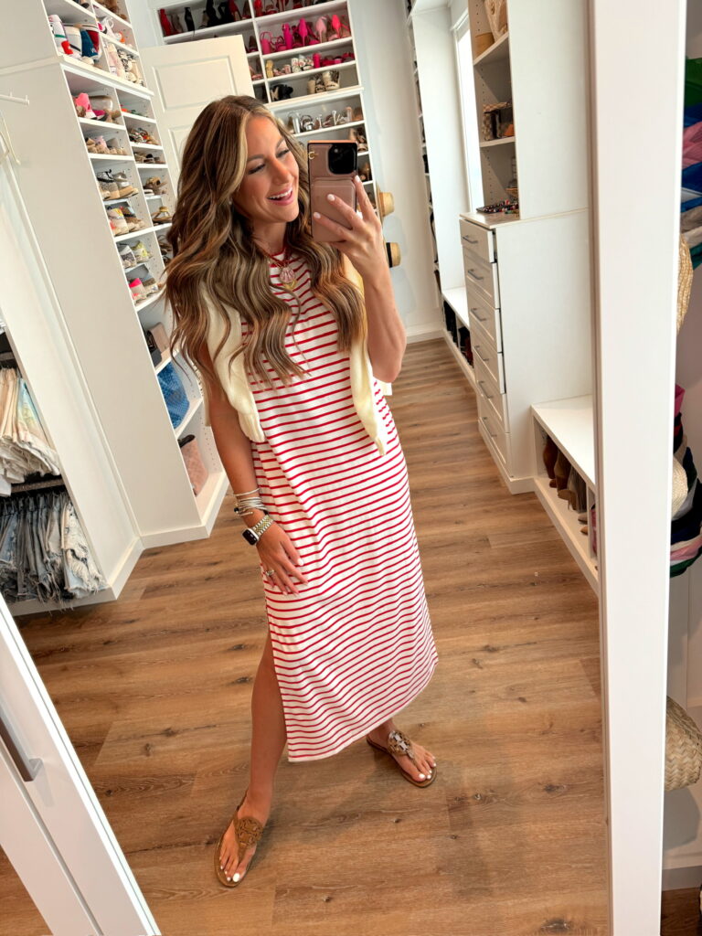 In a medium red white stripe t shirt maxi, American flag sweater, sandals and accessories for patriotic outfit – all fits TTS.