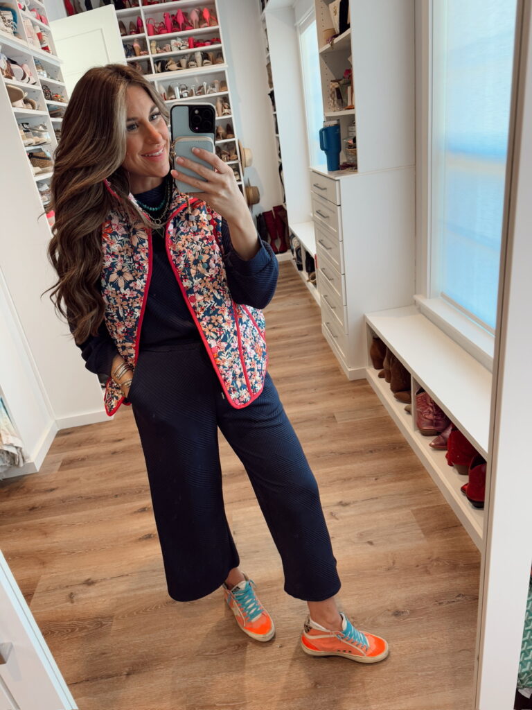 In a size medium in set and colorful quilted vest – fits tts. Shop the items here!