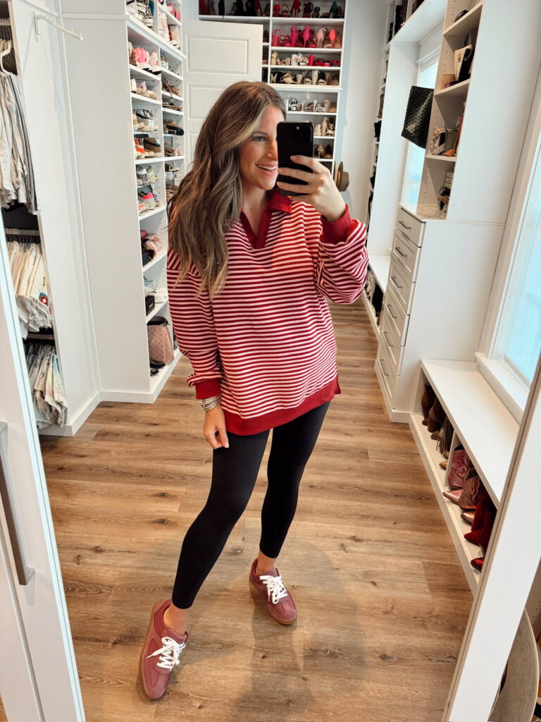 In a large stripe sweatshirt, small maternity leggings and sneakers – all fits tts. Shop the items here!