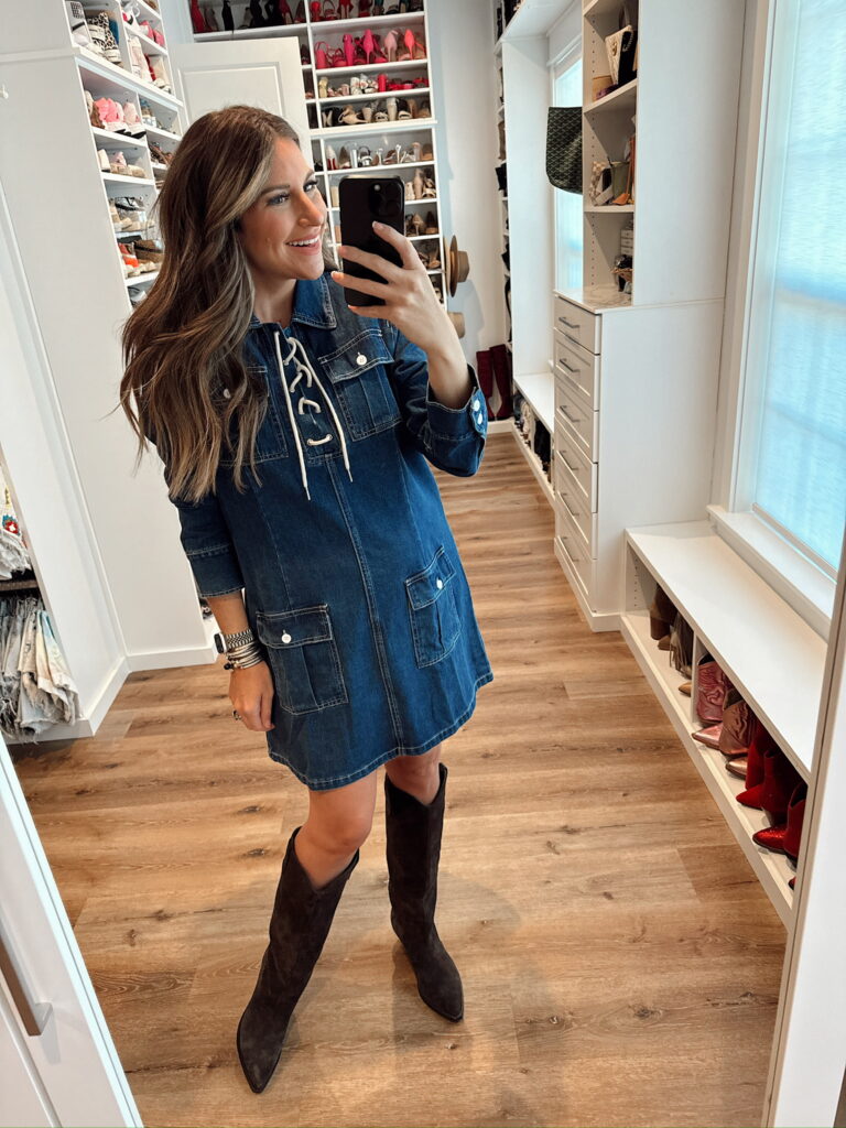 In a medium in denim dress for my bump and knee high boots – all fits tts. Shop the items here!
