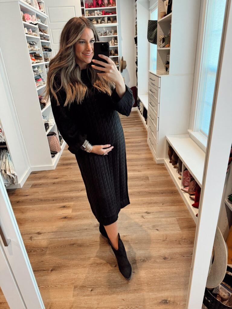 In a medium in sweater dress for my bump, ankle cowboy boots – all fits tts. Shop the items here!