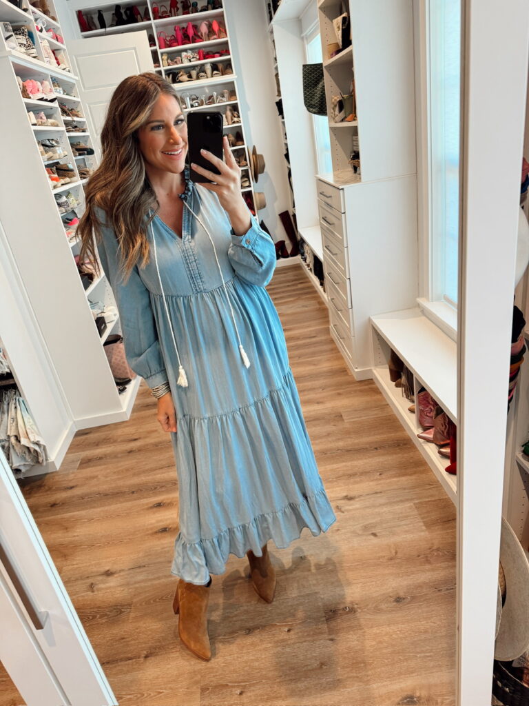 In a medium in denim flowy maxi dress and ankle boots – all fits tts. Shop the items here!