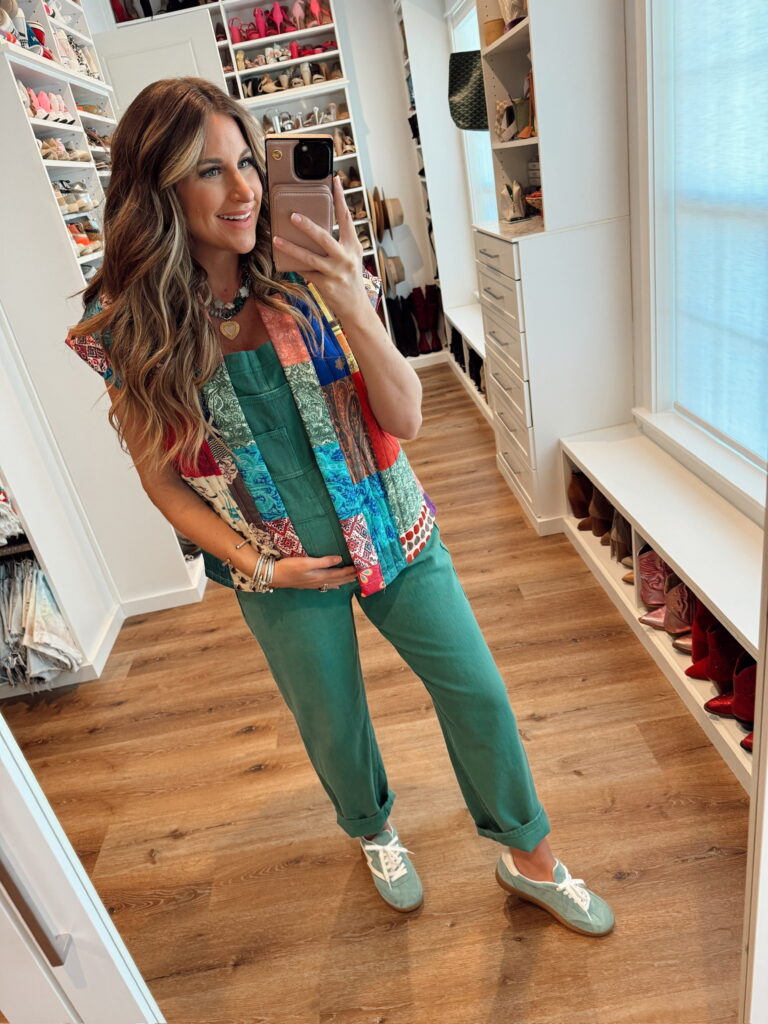I’m a size medium in overalls for my bump, large vest, sneakers -all fit tts. Shop the items here!