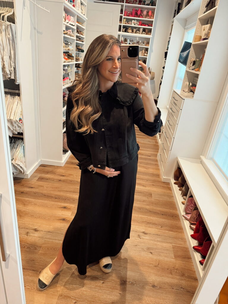 In a small in dress, medium denim jacket – fits tts. Shop the items here!