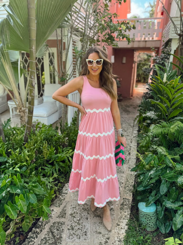 In a small pink maxi with white rick rack trim detail, tie up espadrille wedges, bag, sunglasses and accessories for birthday beach resort outfit – all fits TTS.