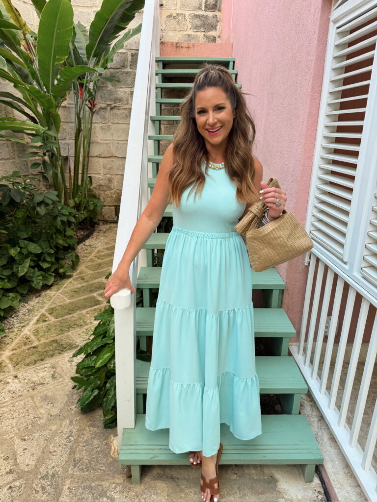 In a small maxi, sandals, bow clutch and accessories for beach resort outfit – all fits TTS.