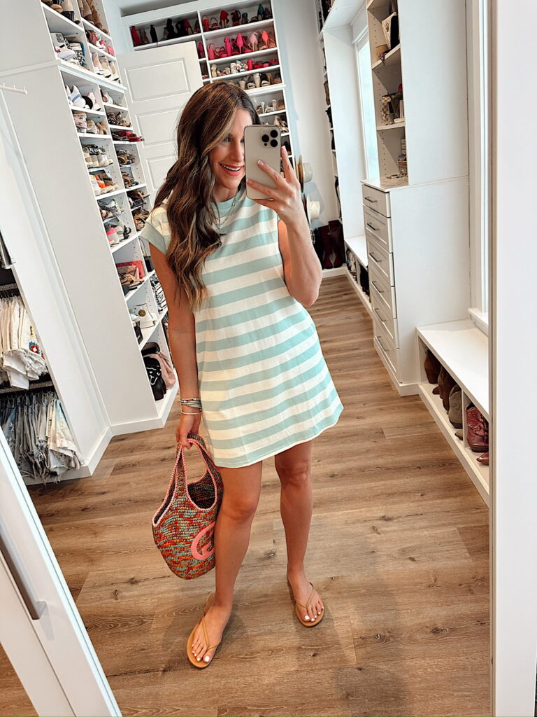 In a medium cap sleeve striped t-shirt dress, tote, sandals and accessories – fits tts. Shop the items here!