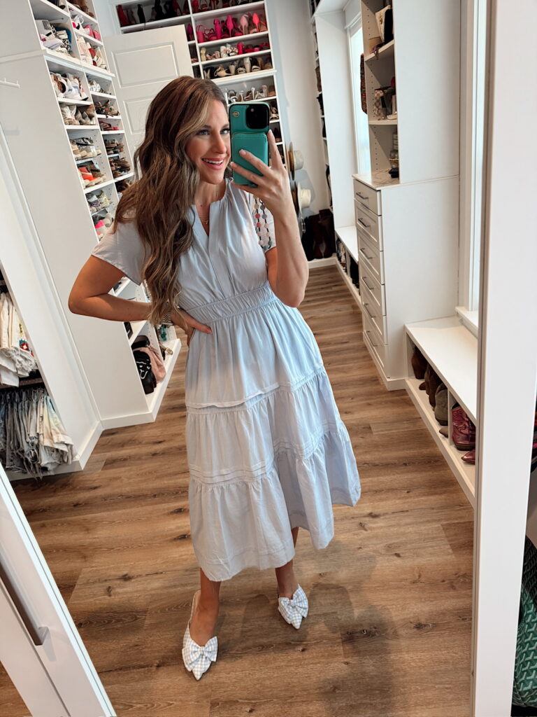 In a medium tiered dress, espadrille flats and accessories – fits tts. Shop the items here!