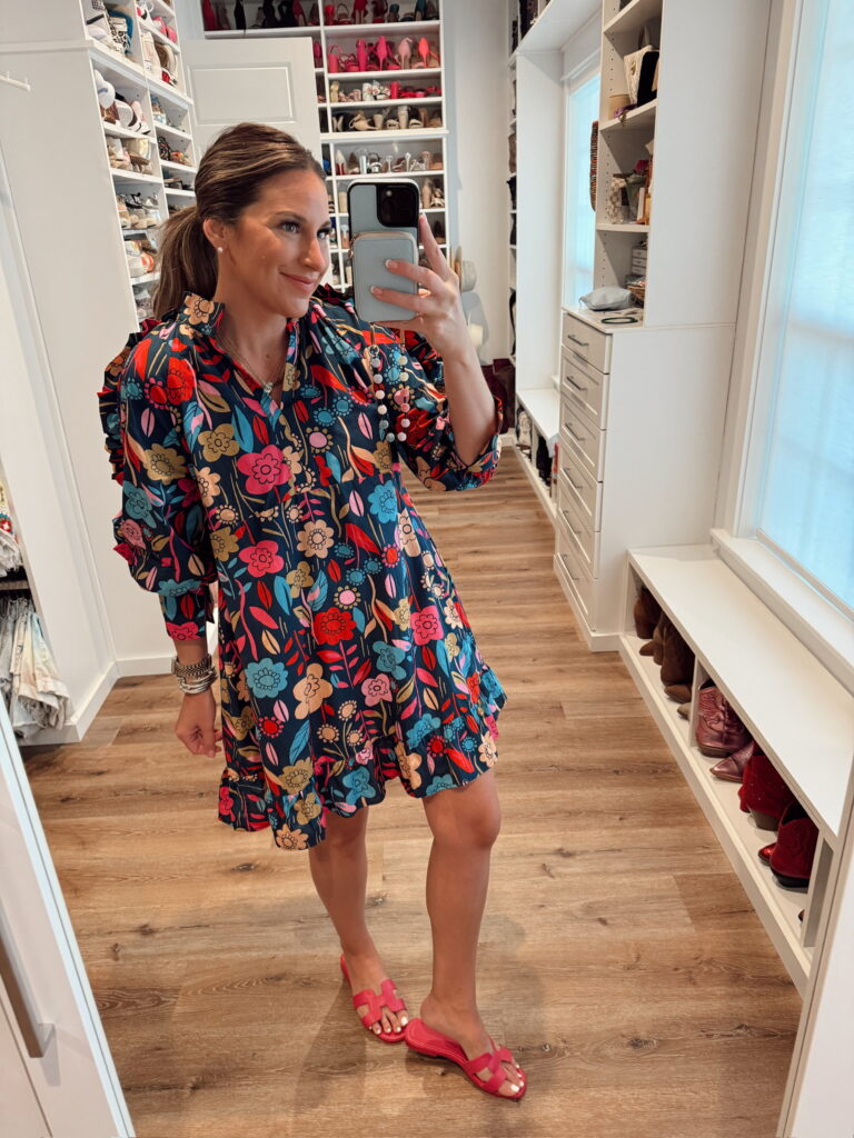 In a medium v neck floral dress, sandals and accessories- fits tts. Shop the items here!