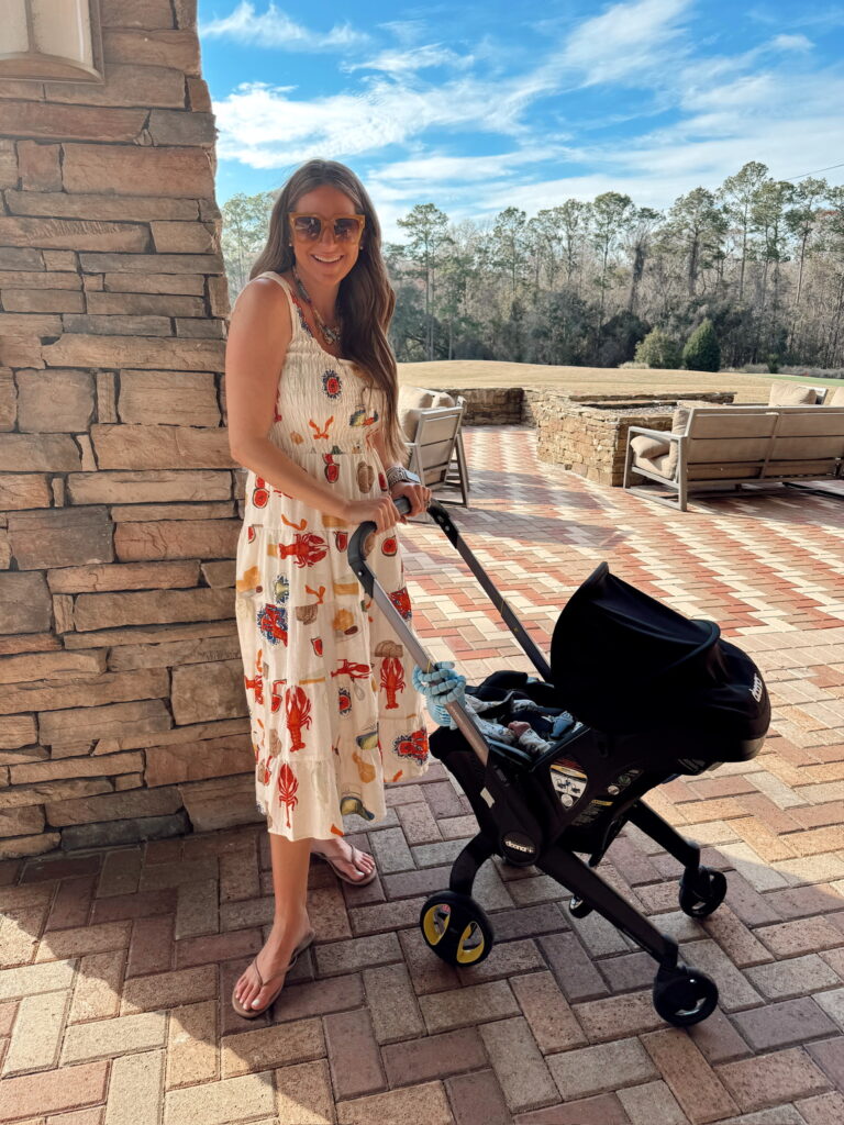 In a medium lobster print midi dress, sandals, sunglasses and accessories- all fits tts. Baby boy stroller, fan and outfit linked! Shop the items here!