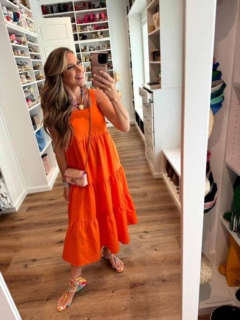 In a medium 3/4 sleeve v neck dress, sandals, tote and accessories – all fits TTS.