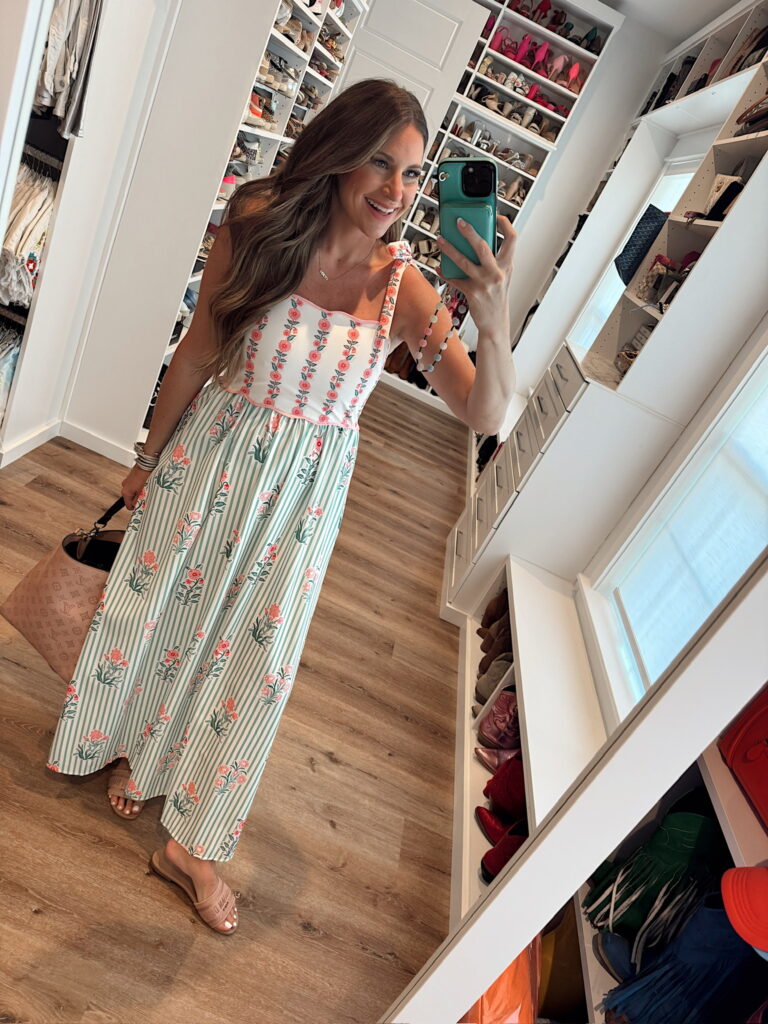 In a small tie shoulder maxi, sandals and accessories – fits tts. Shop the items here!