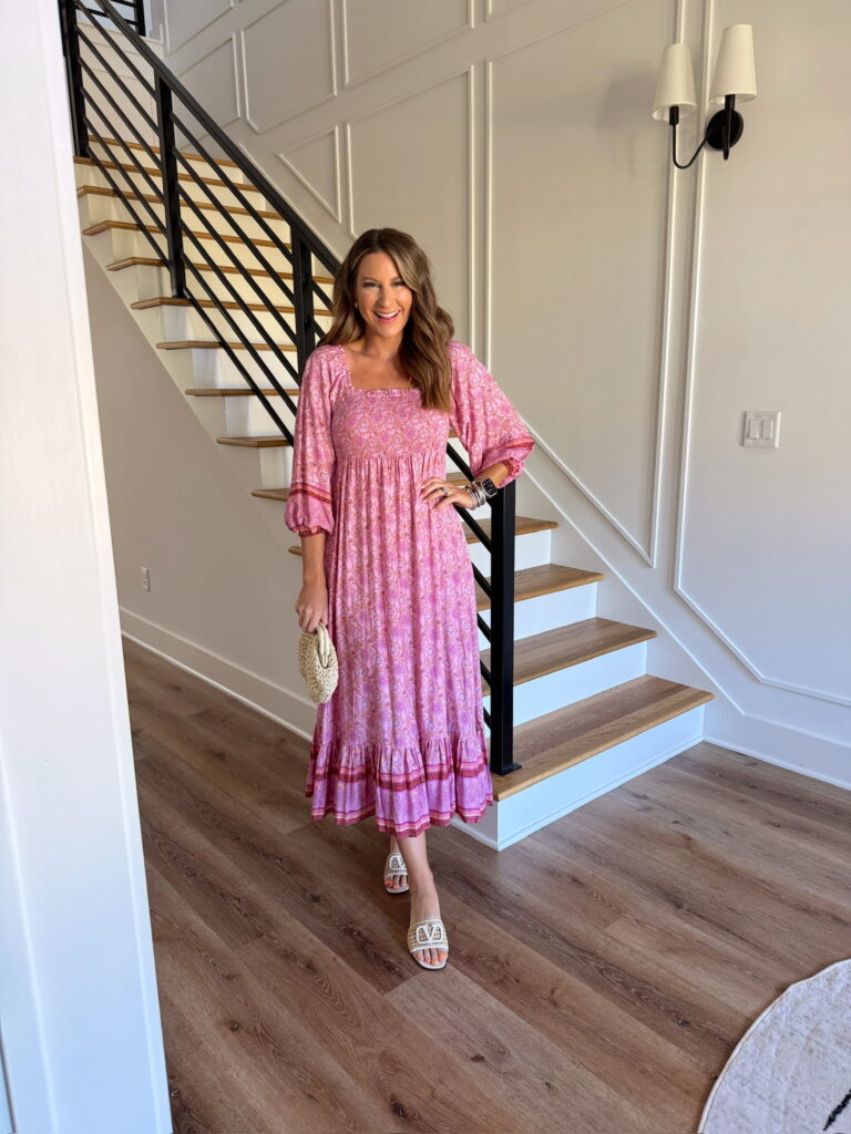 In a small boho maxi, slides, bag and accessories for spring – all fits TTS.
