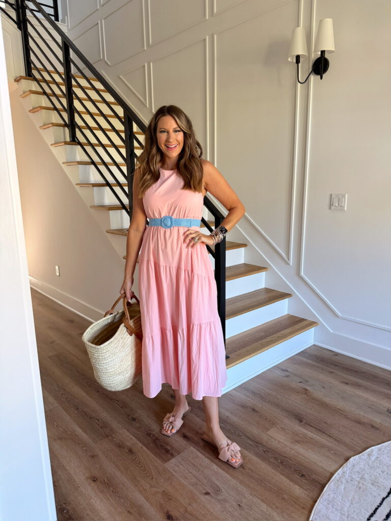 In a small pink midi, bow slides, blue raffia belt, tote and accessories for spring – all fits TTS.