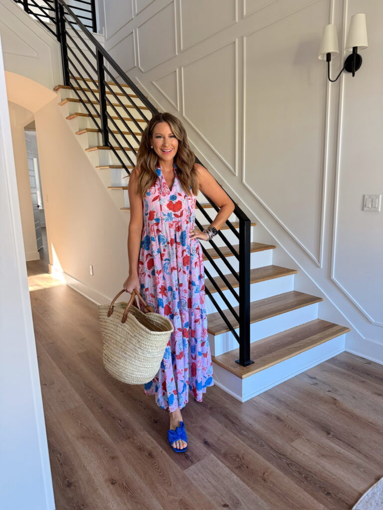 In a medium colorful floral maxi, bow slide sandals, tote and accessories for spring – all fits TTS.